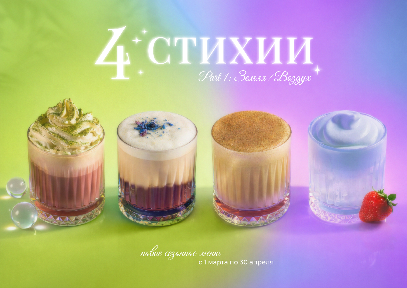 Все напитки в концепции сделаны переходящими между сезонами - один и тот же напиток может присутствовать в двух периодах подряд, но в разном контексте стихии.